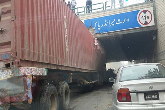 According to the details, the container was headed towards Mall Road when it got stuck at the New Campus underpass that caused a heavy traffic jam hampering people to reach their institutes and offices in time.