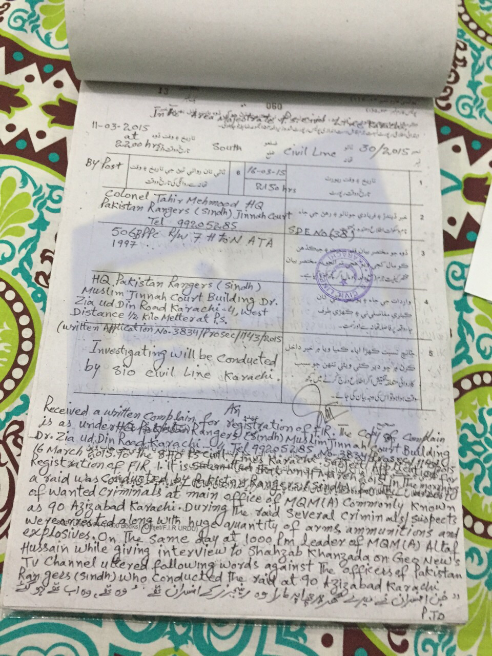 According to details, the case has been registered on complaint of Col. Tahir representing Rangers.