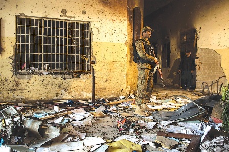 An army soldier stands inside the school after TTP attack