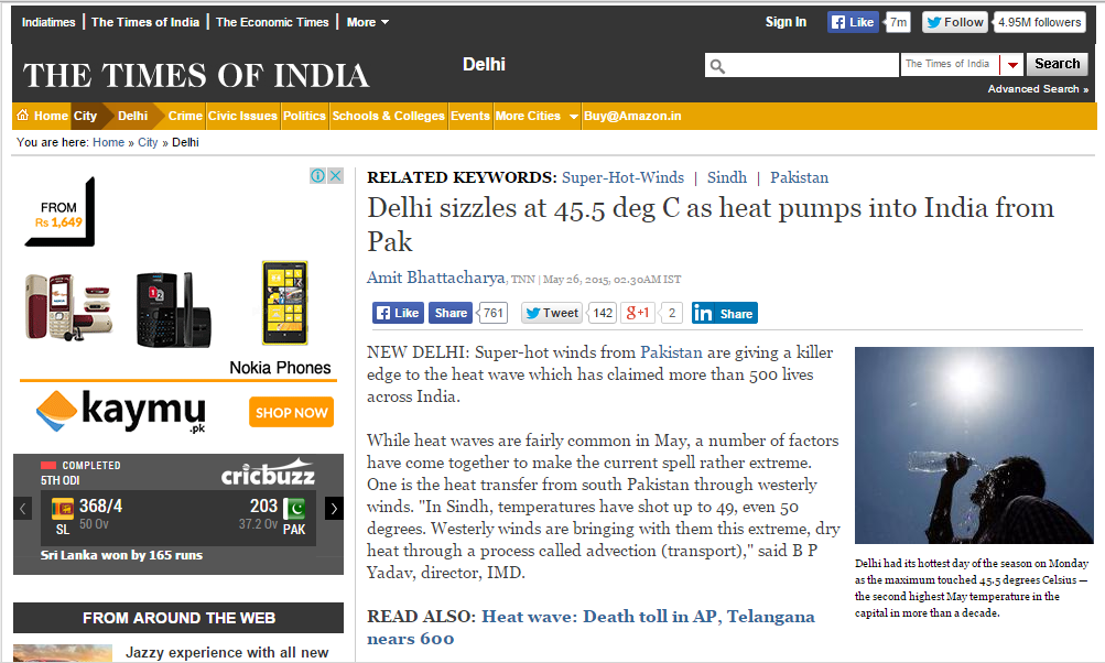 Besides terrorism, Pakistan was also blamed for hot weather in India. Hiding its mismanagement and lack of proper arrangements behind its famous blame game, India says that super-hot winds from Pakistan are giving a killer edge to the heat wave which has claimed more than 2500 lives across the country.
