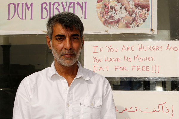 About three weeks ago the Indian brothers who own Zaiqa decided to put up a small makeshift sign offering free food to customers who cannot afford to pay.